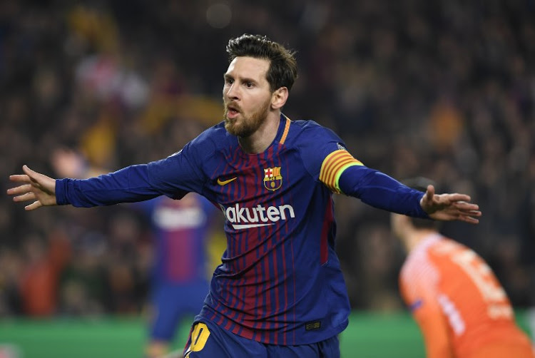 Barcelona’s Argentinian forward Lionel Messi celebrates scoring his team’s third goal during the UEFA Champions League round of sixteen second leg football match between FC Barcelona and Chelsea FC at the Camp Nou stadium in Barcelona on March 14, 2018. / AFP PHOTO / LLUIS GENE